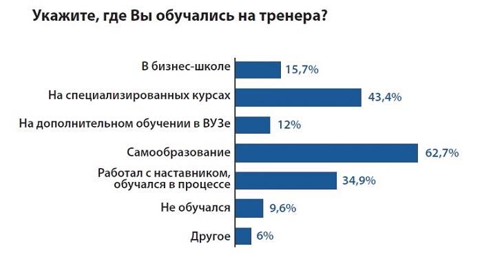 Итоги опроса показали, что большинство преподавателей (54,9%) ежегодно проходят специализированное обучение. При этом они предпочитают самообразование (62,7%), специализированные курсы (43,4%), работу с наставником (34,9%) и обучение в бизнес-школе (15,7%). Только 9,6% опрошенных заявили, что не получали специализированного образования.